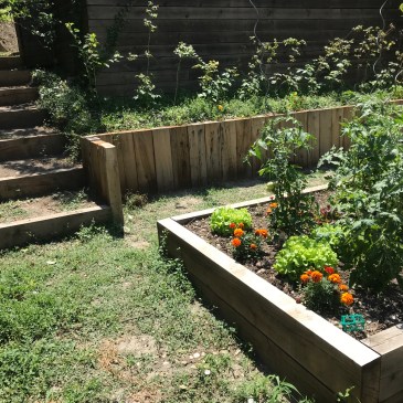 Dans une démarche de consommation locale, les clients ont le souhait de cultiver une partie de leur alimentation et donc de revoir complètement l’espace potager. Initialement dans la pente, le potager se composait de trois carrés de planches de bois posés sur le sol, la pente rendant difficile la pratique dans cet espace. Un travail de nivellement et de soutènement permet donc d’élargir la zone et l’espace utile pour cultiver. Les surfaces potagères sont de grands bacs, dont les parois sont faites de traverses de chêne brutes, et remplis de la terre qui a été décaissée. La partie haute du soutènement est plantées de petits fruits, framboisiers et fraisiers déjà présents dans l’ancien potager. Un escalier d’accès est ainsi ménagé le long de la piscine afin d’accéder au potager plus facilement.